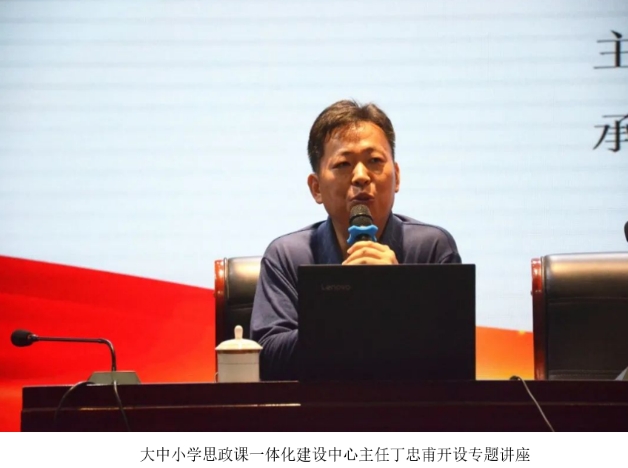 第三阶段,丁忠甫以“大中小学思政课一体化建设的要点分析”为题,进行专题讲座。他从当前大中小学思政课一体化建设的背景意义、问题分析、建设重点、实现路径四个方面进行了解读,强调要深研大中小学思政课一体化政策文件,整合各类资源,善用多元平台,活化渠道方法,为国家塑造信念执着的忠诚之才、品德优良的高尚之才、本领过硬的可用之才、敢于担当的时代之才。