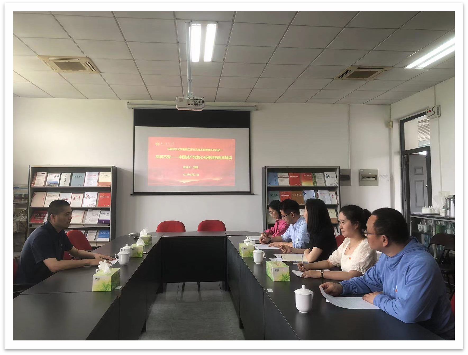 刘锦以“变和不变——中国共产党初心和使命的哲学解读“为题,系统地阐释了中国共产党初心和使命变和不变的哲学内涵。刘锦认为,中国共产党初心和使命不变的是其内容,即要实现国家富强、人民幸福和民族复兴;中国共产党初心和使命变的是其内容实现的形式,即每一社会发展阶段都有特殊的发展任务,如从站起来(革命问题)——富起来(经济发展)——强起来(文化、科技、军事等)历史演变的过程。与会同志对刘锦老师讲座内容进行了热烈的讨论。丁保会认为,我们要铭记党的初心和使命,使其成为日常工作的精神动力;唐文文认为,铭记党的初心和使命可以使我们知道“我是谁”、“我从哪里来”、“要到哪里去”等关键问题;沈隐夕认为,牢记党的初心和使命能够使自身的人生始终保持在正确的道路上,避免误入歧路、邪路和歪路。