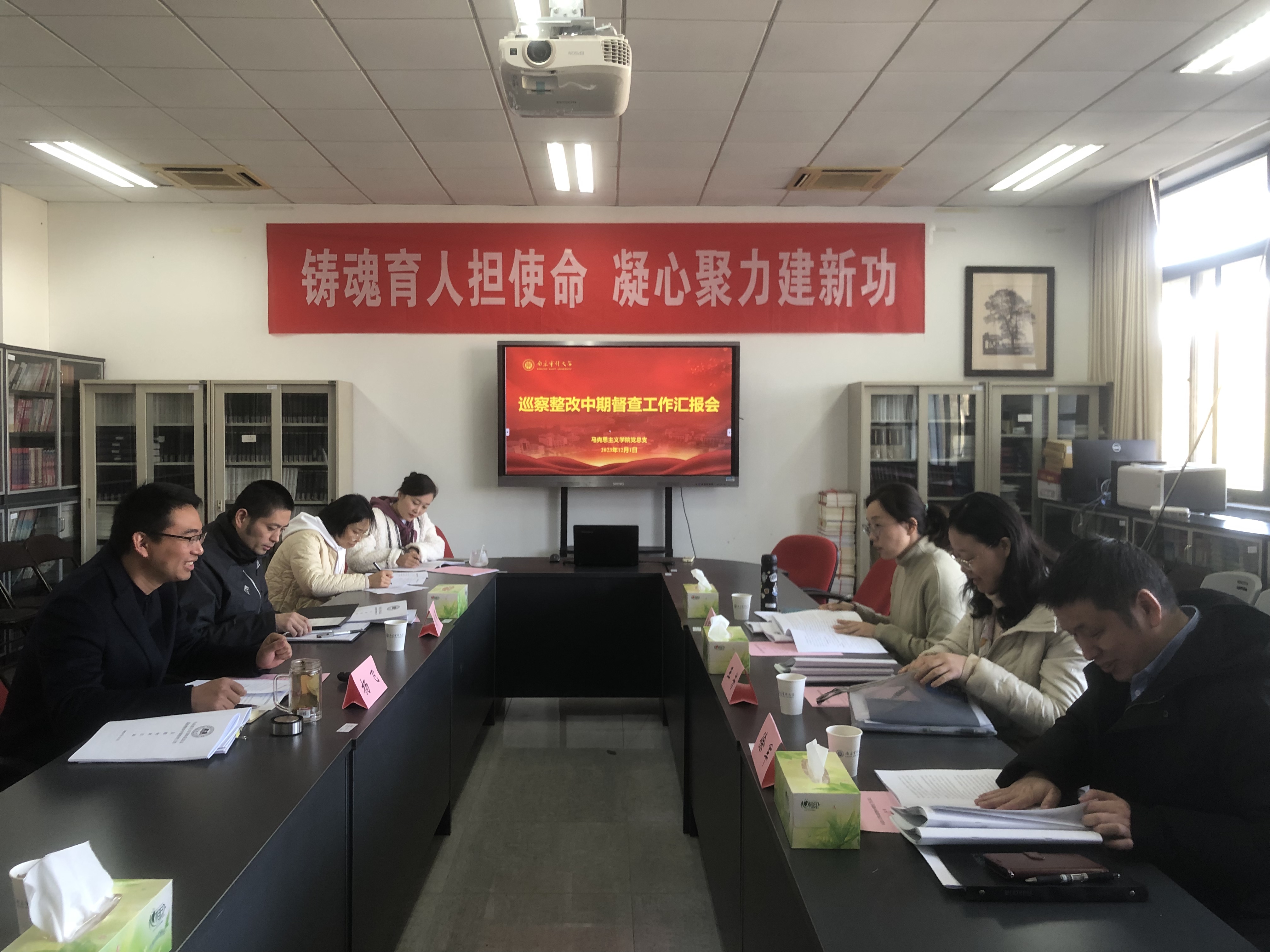 12月1日上午,bevictor伟德官网在文济楼307会议室召开巡察整改中期督查汇报会,校巡察整改联合督查组成员、审计处副处长(主持)王芳,纪委办公室副主任(主持)、党委巡察工作领导小组办公室副主任(兼)徐军和党委巡察工作领导小组办公室专职巡察员(正科职)傅园洁出席,马bevictor伟德官网党总支成员以及相关工作人员参加,会议由党总支副书记杨飞主持。