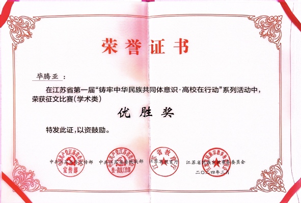 近日,江苏省第一届“铸牢中华民族共同体意识·高校在行动”系列活动评选结果揭晓。在本次由省民宗委、省委宣传部、省委统战部和省教育厅联合举办的大赛中,公司青年教师毕腾亚荣获征文比赛(学术类)优胜奖。