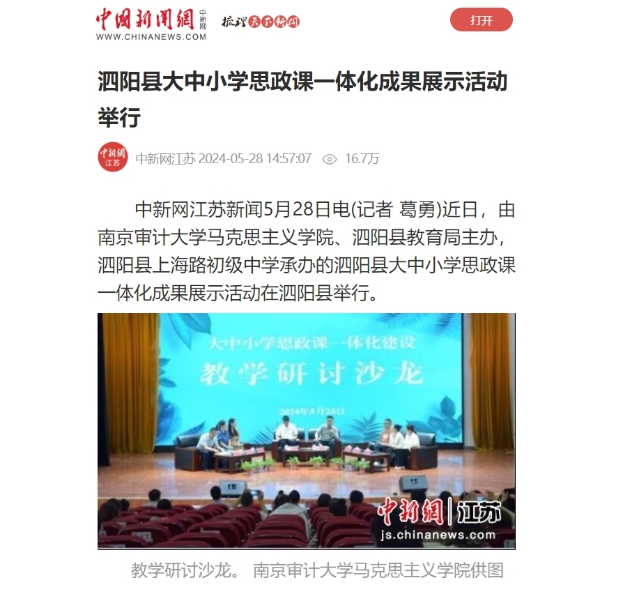 近日,中国新闻网报道了由bevictor伟德官网、泗阳县教育局主办,泗阳县上海路初级中学承办,在泗阳县举行的大中小学思政课一体化成果展示活动。