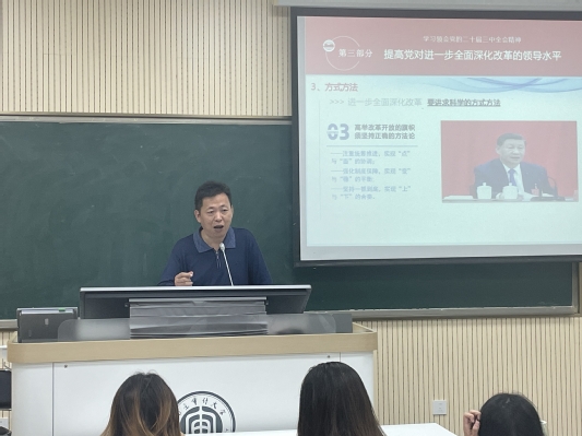 丁忠甫教授围绕党的二十届三中全会的主要内容进行了深入浅出的讲解。他结合当前社会发展的实际案例,生动阐述了会议的核心要义,强调了习近平新时代中国特色社会主义思想的重要指导作用,以及青年一代在实现中华民族伟大复兴中国梦中的使命担当。