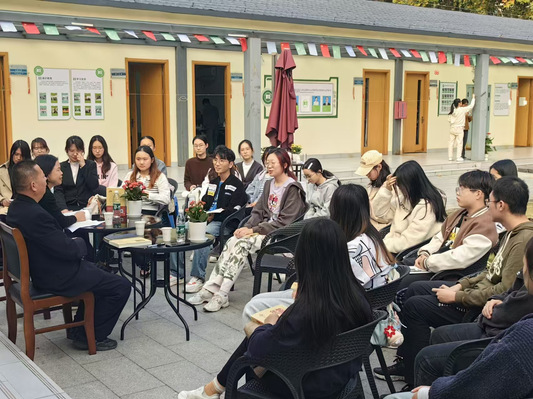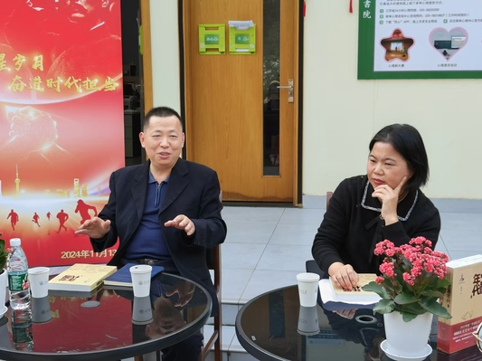 11月13日下午,我院丁忠甫教授和卢芸蓉副教授受邀参加沁园书院读书分享会,与沁园书院的员工们一起阅读《觉醒年代》一书,读书分享会在沁园书院小广场举行。
