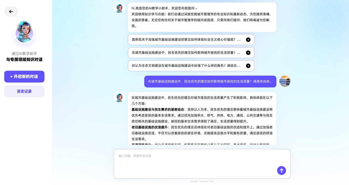 《城市管理学》课程后台配备多样化教学工具,如AI生成课程思政案例、AI生成场景问题、AI知识点出题等等,赋能课程建设、教师备课、课堂教学及应用各个环节。