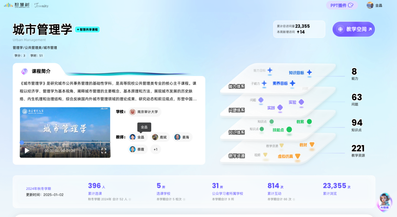 《城市管理学》课程为江苏省线上线下混合式一流课程、江苏省首批虚拟仿真实验教学一流课程、江苏省首批产教融合型一流课程、江苏省课程思政典型案例,被新华网新华思政作为“课程思政示范课”收录,开展教育部“慕课西部行”活动被“学习强国”等国家媒体报道,荣获第六届全国高校混合式教学设计创新大赛一等奖、慕课西部行专项奖、第三届江苏省教师教学创新大赛一等奖、江苏省高等教育科学研究优秀成果二等奖。课程负责人为国家一流专业建设点负责人,课程团队聚焦课程教学目标、员工学习需求和教学中的真实问题,重构课程内容,建设AI智慧共享课程。通过深度整合课程资源、知识图谱与人工智能技术,构建了一个体系化、结构化和可视化的知识框架,助力员工系统掌握课程的核心知识点,定制个性化学习路径。在丰富教学内容的同时,构建以问题和能力为导向的图谱体系,实现从理论知识到实际能力的有效转化,让教学过程更加精准高效。