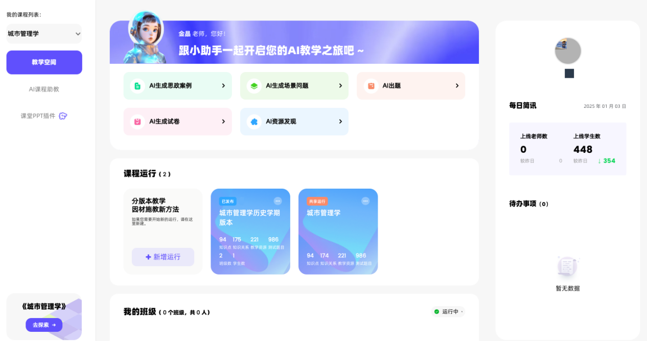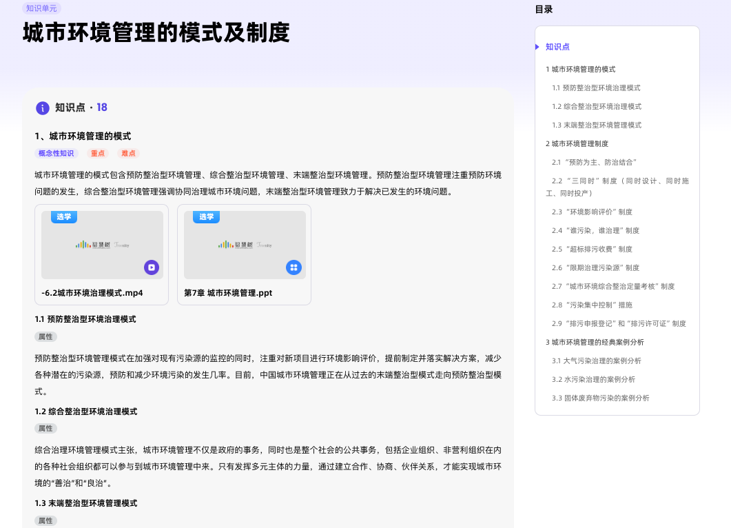 《城市管理学》课程后台配备多样化教学工具,如AI生成课程思政案例、AI生成场景问题、AI知识点出题等等,赋能课程建设、教师备课、课堂教学及应用各个环节。