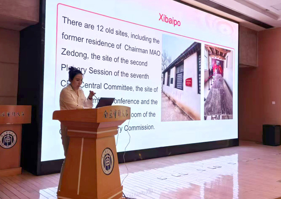 陈欢欢在英文讲授中介绍,西柏坡是被称为“新中国摇篮”的红色圣地,中国共产党在西柏坡指挥三大战役、召开七届二中全会,孕育了以“两个务必”为核心的西柏坡精神。她通过煤油灯、手绘作战地图和一支盘尼西林的生动故事展现中国共产党的初心以及“人民至上”的价值理念。在西柏坡诞生的《中国土地法大纲》见证了党为人民谋幸福的初心,从在西柏坡提出的《六条规定》与十八大以来的《八项规定》的一脉相承,体现了党一以贯之对作风建设和廉洁自律的高度重视,始终将保持同人民群众的血肉联系作为重中之重。从“两个务必”到“三个务必”,体现了党在新时代新征程上对自身使命任务的深刻把握,对历史经验的继承与发展。